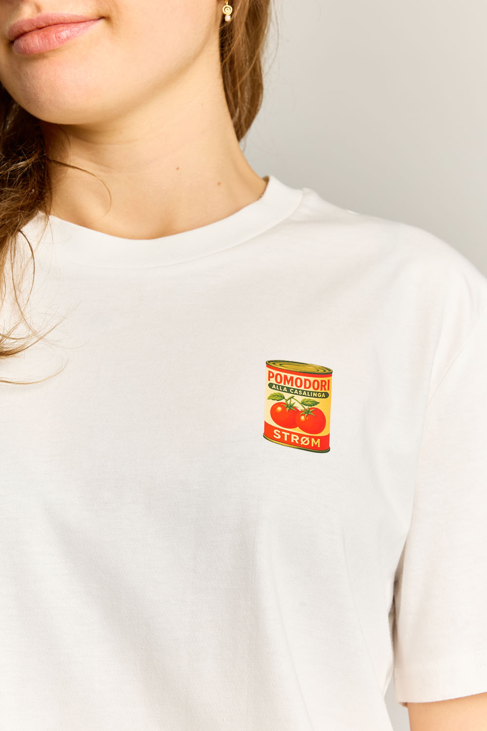 Een regular size off-white t-shirt met een opvallende pomodori frontprint.