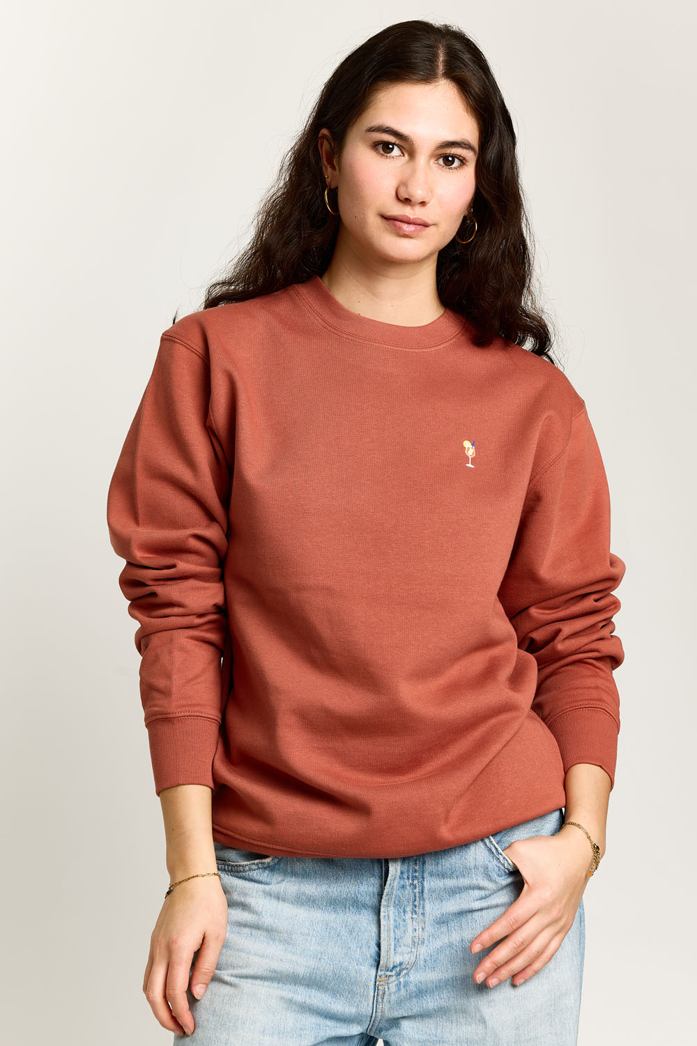 Een heritage bruine trui in normale maat met een spritz-pictogram op de borst.